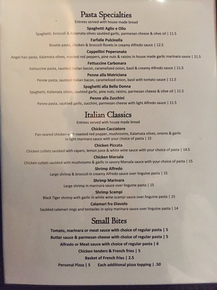 Angel hair pasta, kalamata olives, roasted red peppers. Pine nuts & raisins in house made garlic marinara sauce.